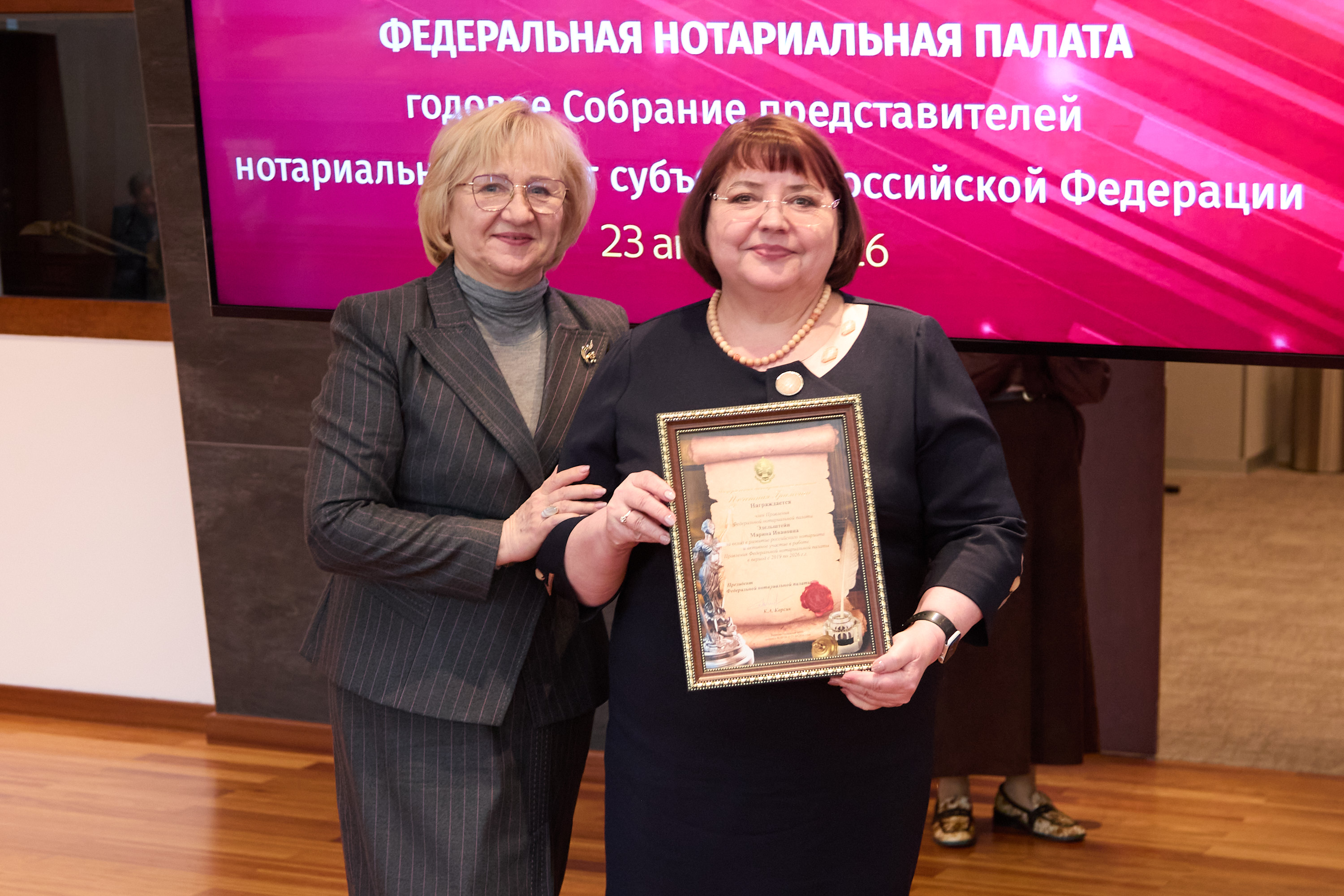 Завершающей частью мероприятия стала церемония награждения. Почетной грамотой ФНП за вклад в развитие российского нотариата были награждены члены Правления ФНП состава 2019-2026 гг.: Наталья Гончарова, Светлана Зылевич, Александра Игнатенко, Кирилл Лазорин, Галина Николаева, Мария Терехова, Марина Эдельштейн.